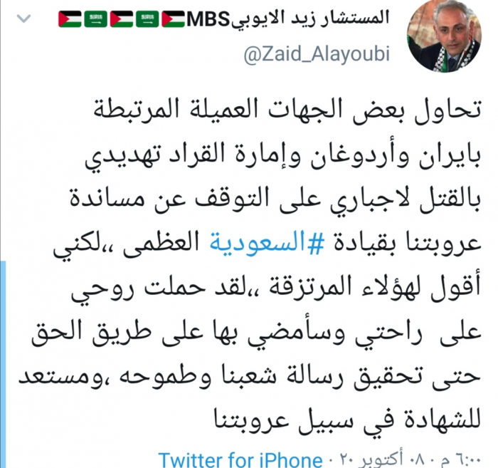 وقال الأيوبي في تغريدة له عبر حسابه بتويتر ورصدها "المشهد العربي" : "تحاول بعض الجهات العميلة المرتبطة بإيران وأردوغان وإمارة القراد تهديدي بالقتل لإجباري على التوقف عن مساندة عروبتنا بقيادة السعودية العظمى".