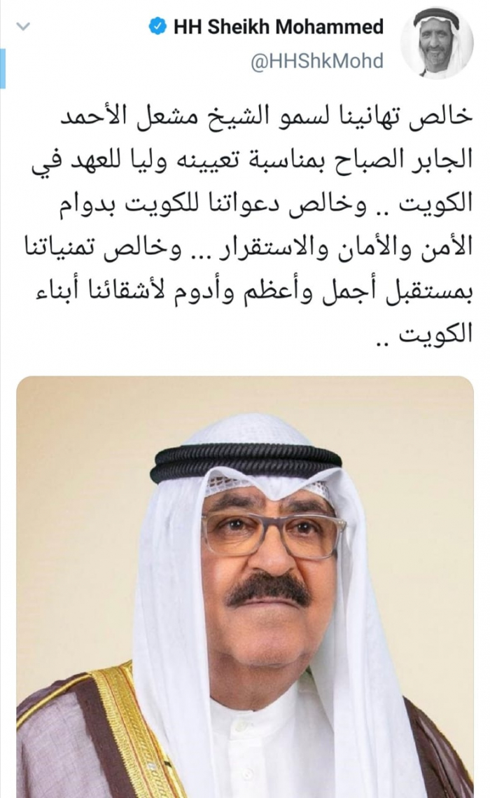 هنأ نائب رئيس الإمارات رئيس مجلس الوزراء حاكم دبي الشيخ محمد بن راشد آل مكتوم، الشيخ مشعل الأحمد الجابر الصباح بمناسبة تعيينه وليا للعهد في الكويت.