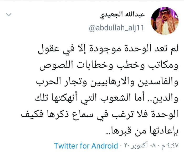 وكتب الجعيدي عبر تغريدة له على "تويتر" رصدها "المشهد العربي": " لم تعد الوحدة موجودة إلا في عقول ومكاتب وخطب وخطابات اللصوص والفاسدين والإرهابيين وتجار الحرب والدين".