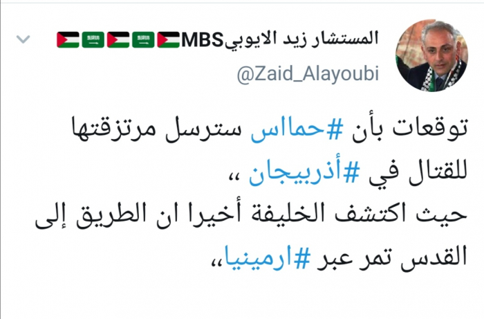وقال الأيوبي في تغريدة له عبر حسابه بتويتر ورصدها "المشهد العربي" توقعات بأن حماس سترسل مرتزقتها للقتال في أذربيجان".