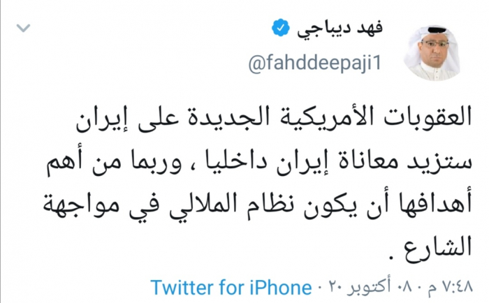 وقال ديباجي عبر حسابه في تويتر ورصدها "المشهد العربي" قائلاً: " العقوبات الأمريكية الجديدة على إيران ستزيد معاناة إيران داخليا ، وربما من أهم أهدافها أن يكون نظام الملالي في مواجهة الشارع".