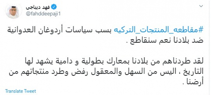 دعا المحلل السياسي السعودي فهد ديباجي، اليوم، الدول العربية لمقاطعة المنتجات التركية.