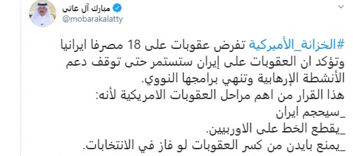 كشف الباحث السياسي السعودي مبارك آل عاتي، اليوم، أهمية العقوبات الأمريكية الجديدة على إيران.
