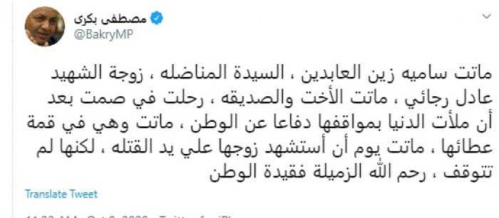 وقال في تغريدة عبر "تويتر" رصدها "المشهد العربي": "ماتت سامية زين العابدين، السيدة المناضلة، زوجة الشهيد عادل رجائي، ماتت الأخت والصديقة، رحلت في صمت بعد أن ملأت الدنيا بمواقفها دفاعا عن الوطن، ماتت وهي في قمة عطائها، ماتت يوم أن استشهد زوجها علي يد القتلة، لكنها لم تتوقف، رحم الله الزميلة فقيدة الوطن".