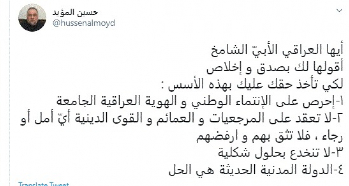 وكتب في تغريدة عبر "تويتر" رصدها "المشهد العربي": "أيها العراقي الأبيّ الشامخ أقولها لك بصدق وإخلاص لكي تأخذ حقك عليك بهذه الأسس: إحرص على الإنتماء الوطني والهوية العراقية الجامعة لا تعقد على المرجعيات والعمائم والقوى الدينية أيّ أمل أو رجاء ، فلا تثق بهم وارفضهم".