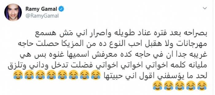وكتب "جمال"، عبر "تويتر": "بصراحة بعد فترة عناد طويلة واصرار اني مَش هسمع مهرجانات ولا هقبل أحب النوع ده من المزيكا حصلت حاجة غريبة جدًا".