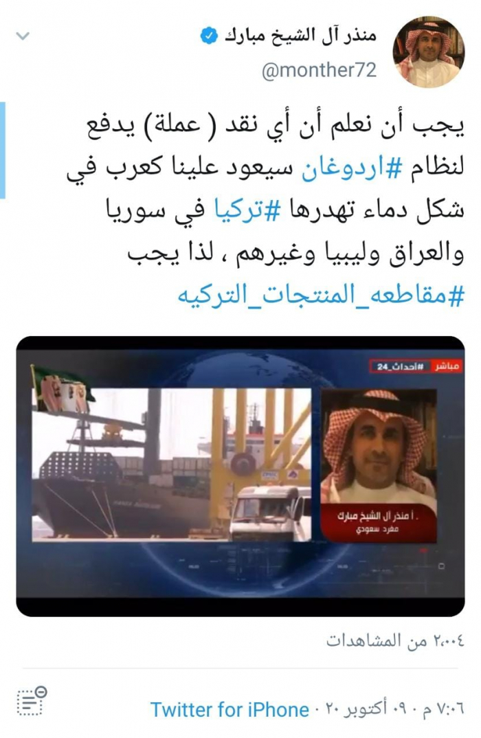 وكتب آل شيخ المبارك عبر تغريدة له على "تويتر" رصدها " المشهد العربي": "يجب أن نعلم أن أي نقد ( عملة) يدفع لنظام أردوغان سيعود علينا كعرب في شكل دماء تهدرها تركيا في سوريا والعراق وليبيا وغيرهم".