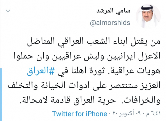 وقال المرشد في تغريدة له عبر حسابه بتويتر ورصدها "المشهد العربي": "من يقتل أبناء الشعب العراقي المناضل الأعزل ايرانيين وليسُ عراقيين وإن حملوا هويات عراقية".