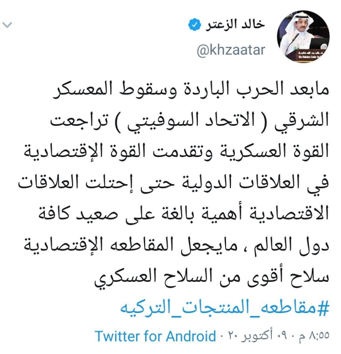 وكتب الزعتر عبر تغريدة له على "تويتر" رصدها "المشهد العربي": "مابعد الحرب الباردة وسقوط المعسكر الشرقي ( الاتحاد السوفيتي ) تراجعت القوة العسكرية وتقدمت القوة الإقتصادية في العلاقات الدولية".