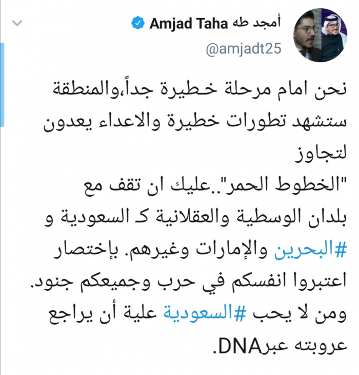 وتابع:" باختصار اعتبروا أنفسكم في حرب وجميعكم جنود،ومن لا يحب السعودية علية أن يراجع عروبته عبرDNA".