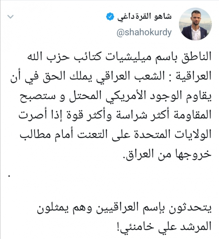 وكتب داغي عبر تغريدة له على "تويتر" رصدها " المشهد العربي": "الناطق باسم ميليشيات كتائب حزب الله العراقية : الشعب العراقي يملك الحق في أن يقاوم الوجود الأمريكي المحتل و ستصبح المقاومة أكثر شراسة وأكثر قوة إذا أصرت الولايات المتحدة على التعنت أمام مطالب خروجها من العراق".