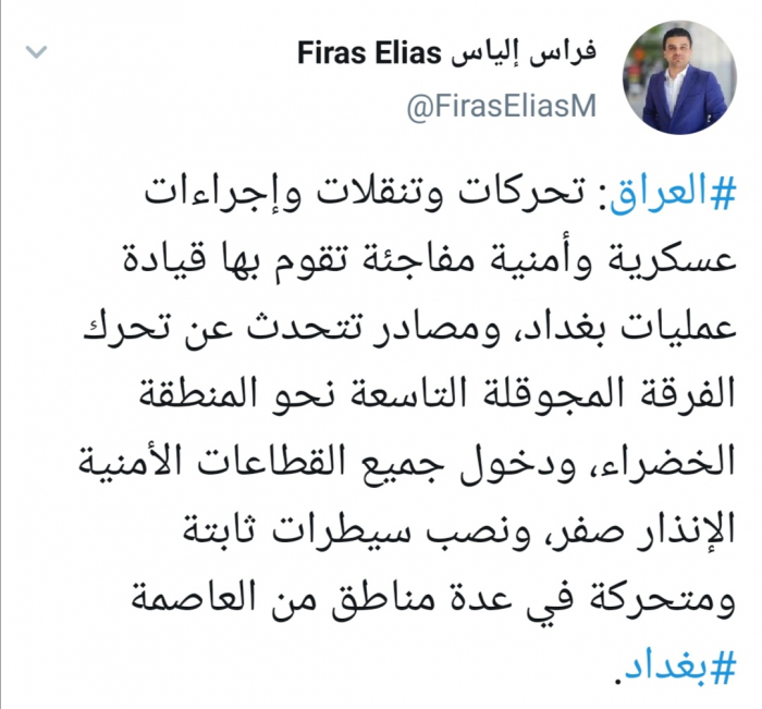 وأشار إلياس في تغريدة له عبر حسابه بتويتر ورصدها المشهد العربي" إلى أن هناك مصادر تتحدث عن تحرك الفرقة المجوقلة التاسعة نحو المنطقة الخضراء، ودخول جميع القطاعات الأمنية الإنذار صفر، ونصب سيطرات ثابتة ومتحركة في عدة مناطق من العاصمة بغداد.