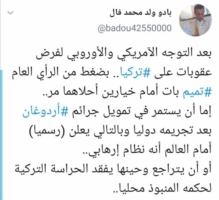 وأوضح ولد محمد في تغريدة عبر "تويتر" رصدها "المشهد العربي" أن الخيارين هما "إما أن يستمر في تمويل جرائم أردوغان بعد تجريمه دوليا وبالتالي يعلن (رسميا) أمام العالم أنه نظام إرهابي، أو أن يتراجع وحينها يفقد الحراسة التركية لحكمه المنبوذ محليا".