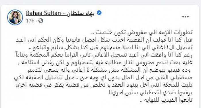 وعلق "بهاء"، على الفيديو ، وكتب: "قبل كدا أنا قولت إن القضية أخذت شكل أفضل قانونيا وكان الحكم أني أعيد تسجيل الـ٤ أغاني اللي أنا اصلًا مسجلهم قبل كدا بشكل سليم واتباعو، رغم كدا أنا وافقت إني أعيد تسجيل الأغاني تاني التزاما بحكم المحكمة وبناء عليه بعت لنصر محروس إنذار مطالبه فيه بتسجيلهم ولكن رفض استلامه".