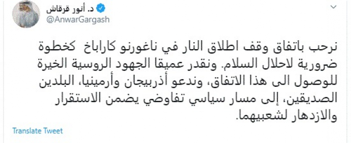 وقال في تغريدة عبر "تويتر" رصدها "المشهد العربي": "نرحب باتفاق وقف إطلاق النار في ناغورنو كاراباخ كخطوة ضرورية لاحلال السلام. ونقدر عميقا الجهود الروسية الخيرة للوصول إلى هذا الاتفاق".