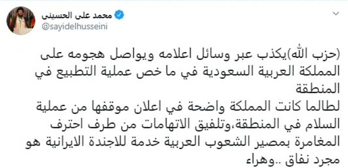 وقال في تغريدة عبر "تويتر" رصدها "المشهد العربي": "(حزب الله) يكذب عبر وسائل إعلامه ويواصل هجومه على المملكة العربية السعودية في ما يخص عملية التطبيع في المنطقة لطالما كانت المملكة واضحة في إعلان موقفها من عملية السلام في المنطقة، وتلفيق الاتهامات من طرف احترف المغامرة بمصير الشعوب العربية خدمة للأجندة الايرانية هو مجرد نفاق ..وهراء".