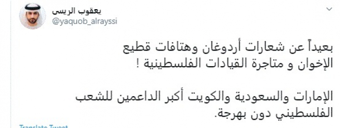 وكتب في تغريدة عبر "تويتر" رصدها "المشهد العربي": "بعيداً عن شعارات أردوغان وهتافات قطيع الإخوان ومتاجرة القيادات الفلسطينية! الإمارات والسعودية والكويت أكبر الداعمين للشعب الفلسطيني دون بهرجة".