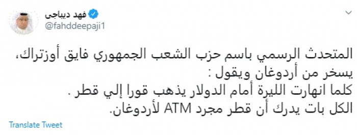 وكتب في تغريدة عبر "تويتر" رصدها "المشهد العربي": "المتحدث الرسمي باسم حزب الشعب الجمهوري فايق أوزتراك، يسخر من أردوغان ويقول: كلما انهارت الليرة أمام الدولار يذهب قورا إلي قطر. الكل بات يدرك أن قطر مجرد ATM لأردوغان".