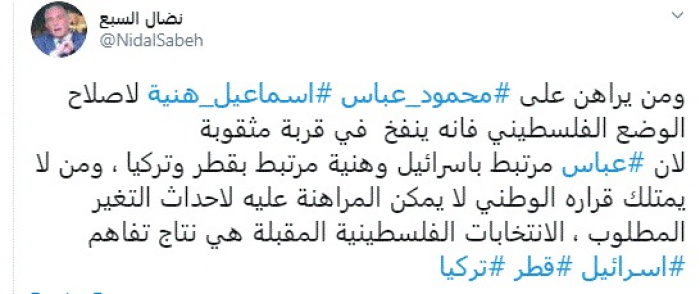 وكتب في تغريدة عبر "تويتر" رصدها "المشهد العربي": "ومن يراهن على محمود عباس إسماعيل هنية لاصلاح الوضع الفلسطيني فانه ينفخ في قربة مثقوبة لأن عباس مرتبط بإسرائيل وهنية مرتبط بقطر وتركيا".