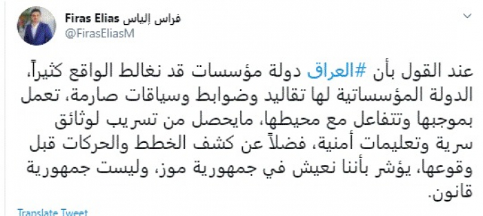 وكتب في تغريدة عبر "تويتر" رصدها "المشهد العربي": "عند القول بأن العراق دولة مؤسسات قد نغالط الواقع كثيراً، الدولة المؤسساتية لها تقاليد وضوابط وسياقات صارمة، تعمل بموجبها وتتفاعل مع محيطها، مايحصل من تسريب لوثائق سرية وتعليمات أمنية، فضلاً عن كشف الخطط والحركات قبل وقوعها، يؤشر بأننا نعيش في جمهورية موز، وليست جمهورية قانون".