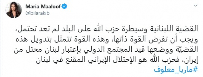 وكتبت في تغريدة عبر "تويتر" رصدها "المشهد العربي": "القضية اللبنانية وسيطرة حزب الله على البلد لم تعد تحتمل، ويجب أن تفرض القوة ذاتها، وهذه القوة تتمثل بتدويل هذه القضيّة ووضعها قيد المجتمع الدولي بإعتبار لبنان محتل من إيران، فحزب الله هو الإحتلال الإيراني المقنع في لبنان".