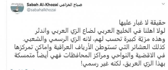 أشاد الأكاديمي والسياسي العراقي صباح الخزاعي، اليوم، بدول الخليج العربي وذلك جراء التزامهم بالزي العربي.