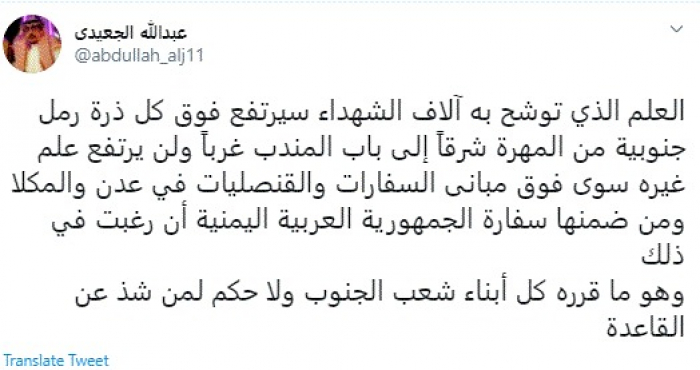 وكتب في تغريدة عبر "تويتر" رصدها "المشهد العربي": "العلم الذي توشح به آلاف الشهداء سيرتفع فوق كل ذرة رمل جنوبية من المهرة شرقًا إلى باب المندب غربًا ولن يرتفع علم غيره سوى فوق مبانى السفارات والقنصليات في عدن والمكلا ومن ضمنها سفارة الجمهورية العربية اليمنية أن رغبت في ذلك وهو ما قرره كل أبناء شعب الجنوب ولا حكم لمن شذ عن القاعدة".