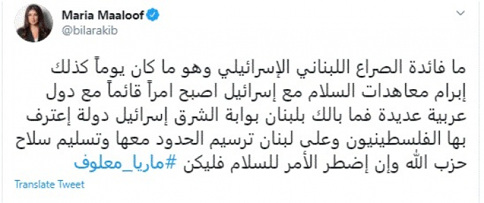 وقالت في تغريدة عبر "تويتر" رصدها "المشهد العربي": "ما فائدة الصراع اللبناني الإسرائيلي وهو ما كان يوماً كذلك إبرام معاهدات السلام مع إسرائيل أصبح أمراً قائماً مع دول عربية عديدة فما بالك بلبنان بوابة الشرق إسرائيل دولة اعترف بها الفلسطينيون وعلى لبنان ترسيم الحدود معها وتسليم سلاح حزب الله وإن إضطر الأمر للسلام فليكن".