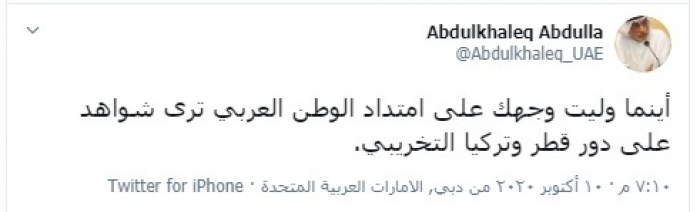 وكتب "عبد الله" تغريدة عبر تويتر، رصدها "المشهد العربي": "أينما وليت وجهك على امتداد الوطن العربي ترى شواهد على دور قطر وتركيا التخريبي".
