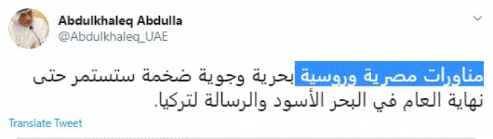 وقال في تغريدة عبر "تويتر" رصدها "المشهد العربي": "مناورات مصرية وروسية بحرية وجوية ضخمة ستستمر حتى نهاية العام في البحر الأسود والرسالة لتركيا".