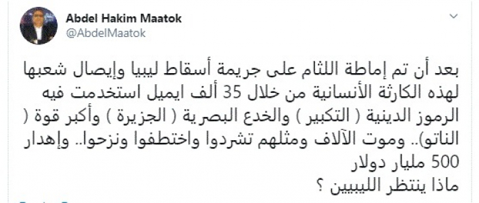 وقال في تغريدة عبر "تويتر" رصدها "المشهد العربي": "بعد أن تم إماطة اللثام على جريمة إسقاط ليبيا وإيصال شعبها لهذه الكارثة الإنسانية من خلال 35 ألف إيميل استخدمت فيه الرموز الدينية (التكبير) والخدع البصرية (الجزيرة) وأكبر قوة (الناتو).. وموت الآلاف ومثلهم تشردوا واختطفوا ونزحوا.. وإهدار 500 مليار دولار ماذا ينتظر الليبيين؟".
