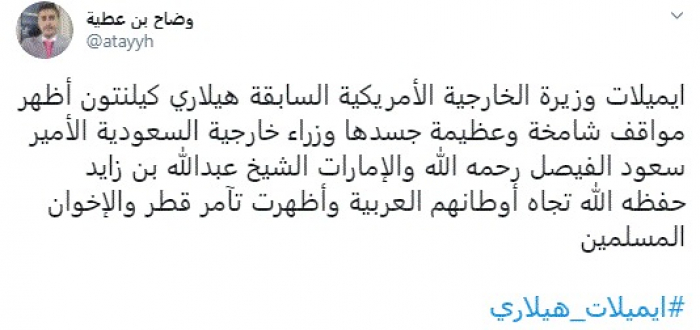 وكتب في تغريدة عبر "تويتر" رصدها "المشهد العربي": "إيميلات وزيرة الخارجية الأمريكية السابقة هيلاري كيلنتون أظهر مواقف شامخة وعظيمة جسدها وزراء خارجية السعودية الأمير سعود الفيصل رحمه الله والإمارات الشيخ عبدالله بن زايد حفظه الله تجاه أوطانهم العربية وأظهرت تآمر قطر والإخوان المسلمين".