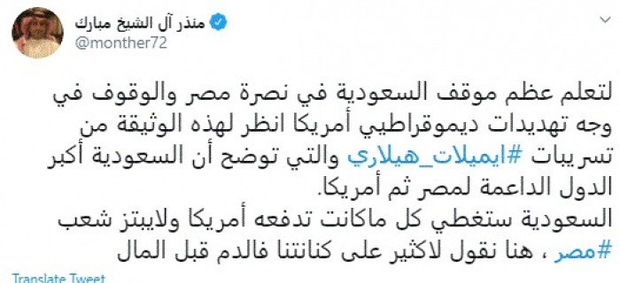 وكتب في تغريدة عبر "تويتر" رصدها "المشهد العربي": "لتعلم عظم موقف السعودية في نصرة مصر والوقوف في وجه تهديدات ديموقراطيي أمريكا انظر لهذه الوثيقة من تسريبات إيميلات هيلاري والتي توضح أن السعودية أكبر الدول الداعمة لمصر ثم أمريكا".