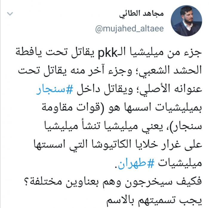 وقال الطائي في تغريدة له عبر حسابه بتويتر ورصدها "المشهد العربي": "جزء من ميليشيا الـpkk يقاتل تحت يافطة الحشد الشعبي؛ وجزء آخر منه يقاتل تحت عنوانه الأصلي؛ ويقاتل داخل سنجار بميليشيات اسسها هو (قوات مقاومة سنجار)".
