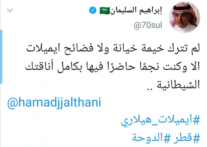وقال السليمان في تغريدة له عبر "تويتر" رصدها "المشهد العربي": "لم تترك خيمة خيانة ولا فضائح إيميلات إلا وكنت نجمًا حاضرًا فيها بكامل أناقتك الشيطانية".