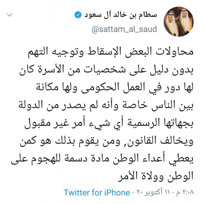 رد الأمير السعودي البارز سطام بن خالد آل سعود، على محاولات البعض توجيه اتهامات لشخصيات بارزة من الأسرة دون دليل.