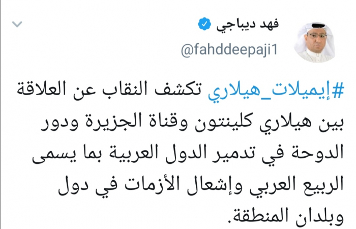 وقال ديباجي عبر حسابه في تويتر ورصدها "المشهد العربي": " إيميلات هيلاري تكشف النقاب عن العلاقة بين هيلاري كلينتون وقناة الجزيرة ودور الدوحة في تدمير الدول العربية بما يسمى الربيع العربي وإشعال الأزمات في دول وبلدان المنطقة".