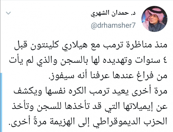 وأضاف الشهري: "مرة أخرى يعيد ترمب الكره نفسها ويكشف عن إيميلاتها التي قد تأخذها للسجن وتأخذ الحزب الديموقراطي إلى الهزيمة مرةً أخرى".