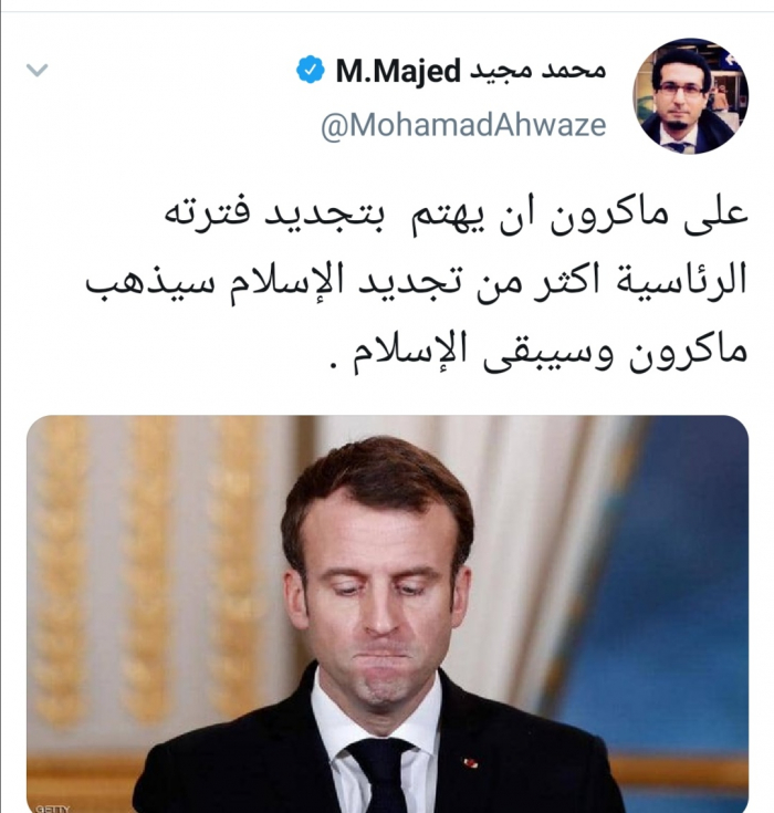 ورد مجيد في تغريدة له عبر حسابه بتويتر ورصدها "المشهد العربي" على الرئيس الفرنسي قائلاً:" على ماكرون أن يهتم بتجديد فترته الرئاسية أكثر من تجديد الإسلام سيذهب ماكرون وسيبقى الإسلام".