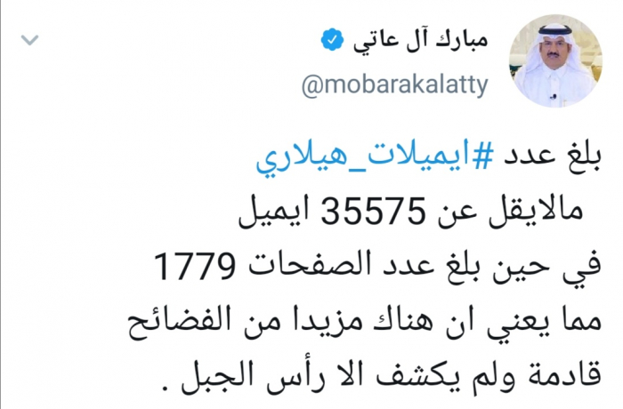 وكتب آل عاتي عبر تغريدة له على "تويتر" رصدها " المشهد العربي": "بلغ عدد #ايميلات_هيلاري مالايقل عن 35575 إيميل