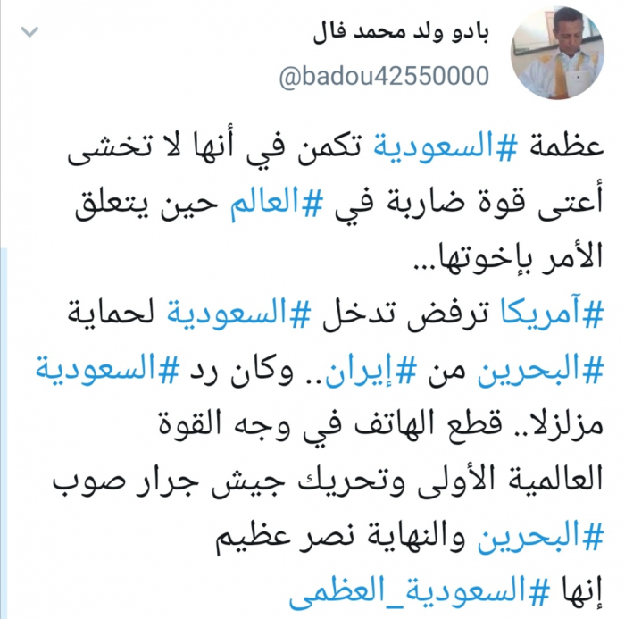وأضاف ولد محمد في تغريدة عبر "تويتر" رصدها "المشهد العربي" : "أمريكا ترفض تدخل السعودية لحماية البحرين من إيران وكان رد السعودية مزلزلا قطع الهاتف في وجه القوة العالمية الأولى وتحريك جيش جرار صوب البحرين والنهاية نصر عظيم"