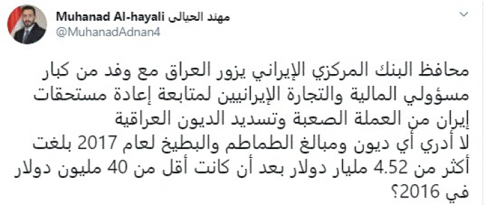 وقال في تغريدة عبر "تويتر" رصدها "المشهد العربي": "محافظ البنك المركزي الإيراني يزور العراق مع وفد من كبار مسؤولي المالية والتجارة الإيرانيين لمتابعة إعادة مستحقات إيران من العملة الصعبة وتسديد الديون العراقية".