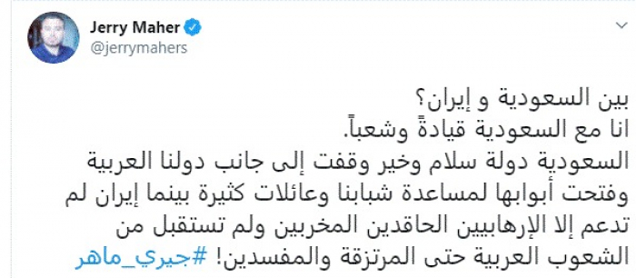 وقال في تغريدة عبر "تويتر" رصدها "المشهد العربي": "بين السعودية وإيران؟ أنا مع السعودية قيادةً وشعباً".