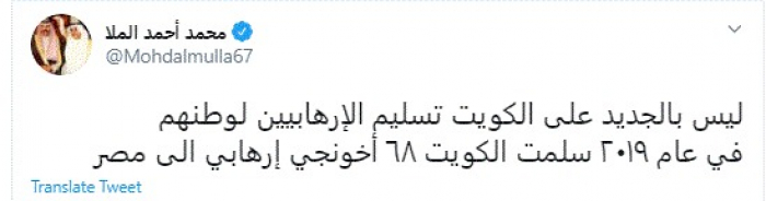 وقال في تغريدة عبر "تويتر" رصدها "المشهد العربي": "ليس بالجديد على الكويت تسليم الإرهابيين لوطنهم في عام ٢٠١٩ سلمت الكويت ٦٨ أخونجي إرهابي الى مصر".