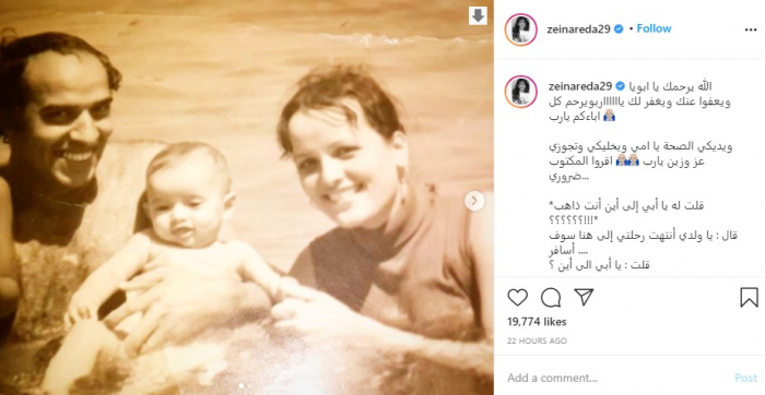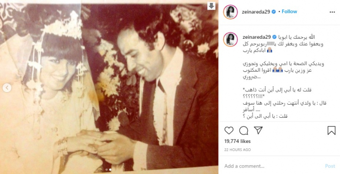 شاركت الفنانة زينة، جمهورها ومتابعيها عبر حسابها بموقع "إنستجرام"، صورة نادرة لها من طفولتها مع والديها، كما نشرت صورة أخري من حفل زفافهما.