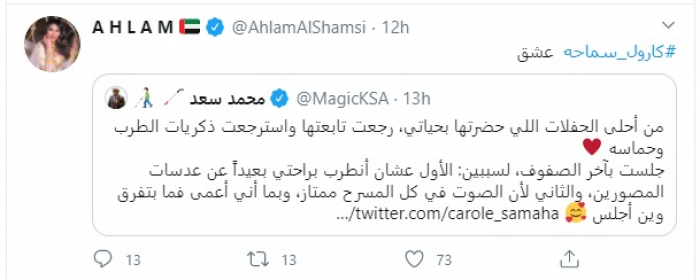هنأت الفنانة اللبنانية كارول سماحة، الفنانة الإماراتية أحلام بمرور 25 عاما، على صدور أول ألبوماتها الغنائية، في مثل هذا اليوم 12 أكتوبر.
