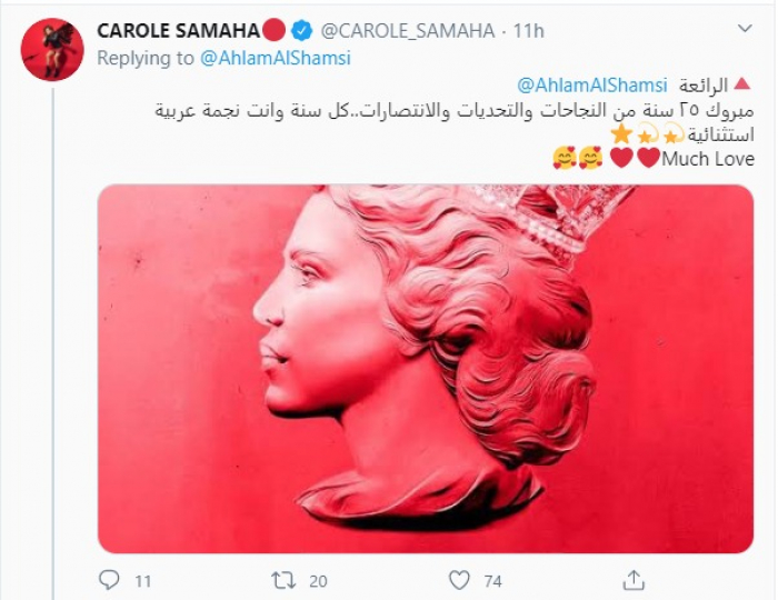 وغردت "كارول"، عبر حسابها بـ"تويتر": "مبروك ٢٥ سنة من النجاحات والتحديات والانتصارات، كل سنة وانت نجمة عربية استثنائية".