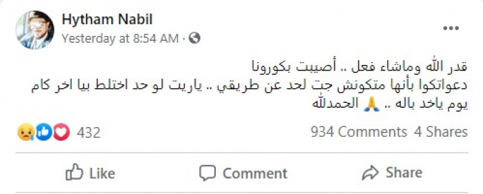 وكتب هيثم "قدر الله وما شاء فعل. أصبت بكورونا.. دعواتكوا بأنها متكونش جت لحد عن طريقي.. ياريت لو حد اختلط بيا اخر كام يوم ياخد باله.. الحمدلله".