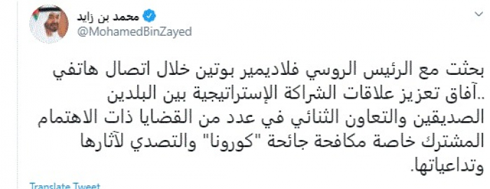 وقال في تغريدة عبر "تويتر" رصدها "المشهد العربي": "بحثت مع الرئيس الروسي فلاديمير بوتين خلال اتصال هاتفي ..آفاق تعزيز علاقات الشراكة الإستراتيجية بين البلدين الصديقين والتعاون الثنائي في عدد من القضايا ذات الاهتمام المشترك خاصة مكافحة جائحة كورونا والتصدي لآثارها وتداعياتها".