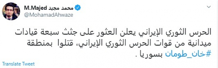 وقال في تغريدة عبر "تويتر" رصدها "المشهد العربي": "الحرس الثوري الإيراني يعلن العثور على جثث سبعة قيادات ميدانية من قوات الحرس الثوري الإيراني، قتلوا بمنطقة خان طومان بسوريا".